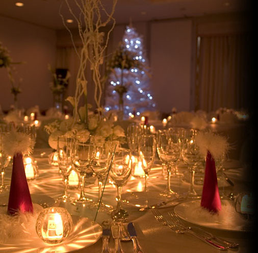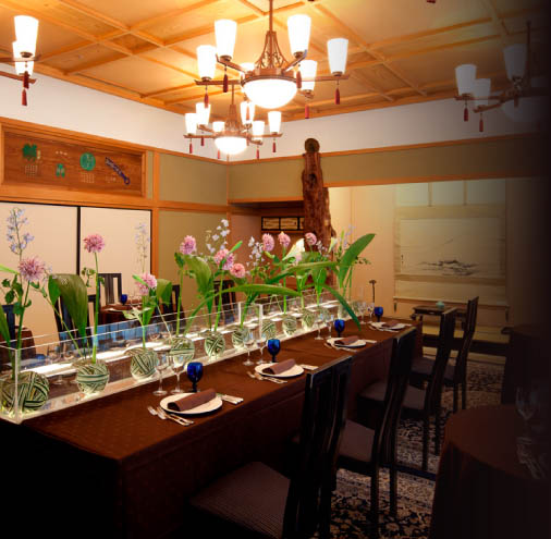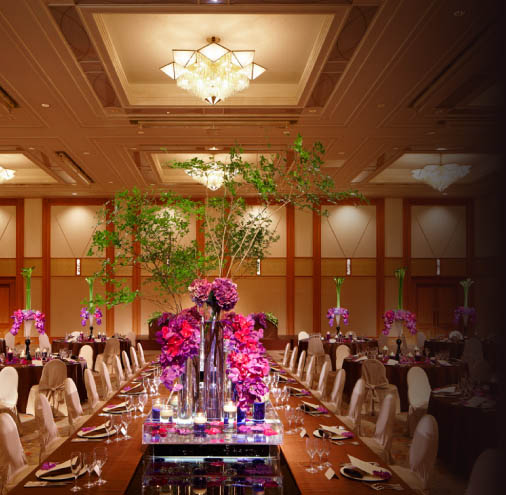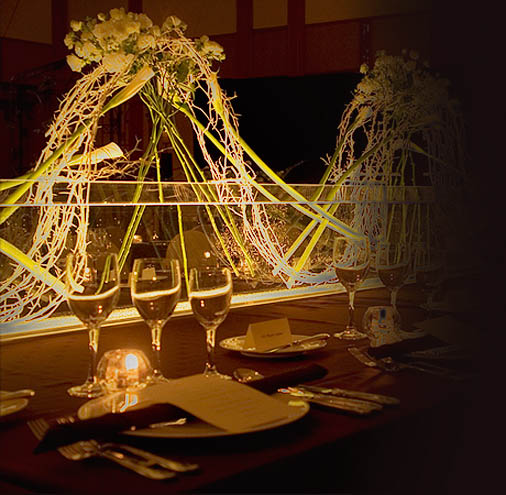 想像力溢れる披露宴会場のコーディネートは、一歩足を踏み入れるとため息がもれるほどの異空間に。光と水が生みだす幻想的な雰囲気の中、スタイリッシュでどこにもないふたりだけの“大人のウェディング”を。